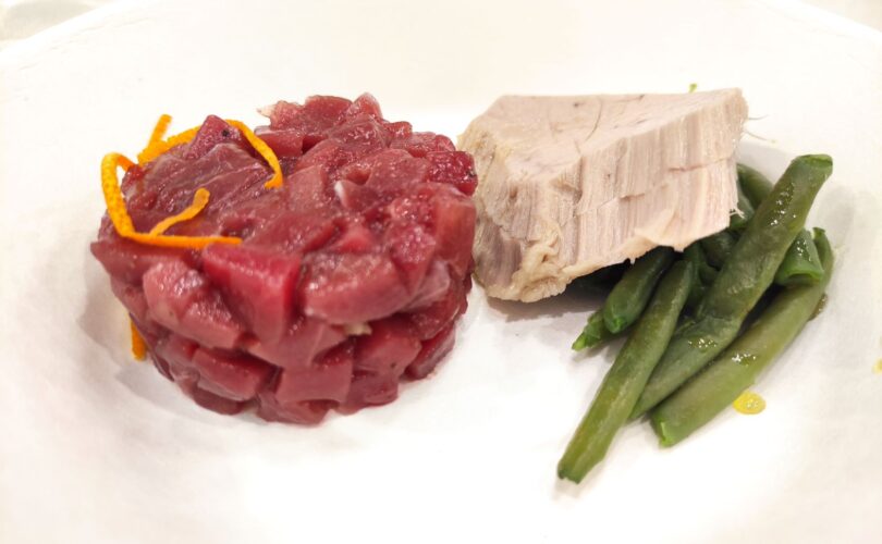 Si inizia con una Tartare di filetto di tonno e da un pezzo di bollito tratto secondo un antica ricetta.